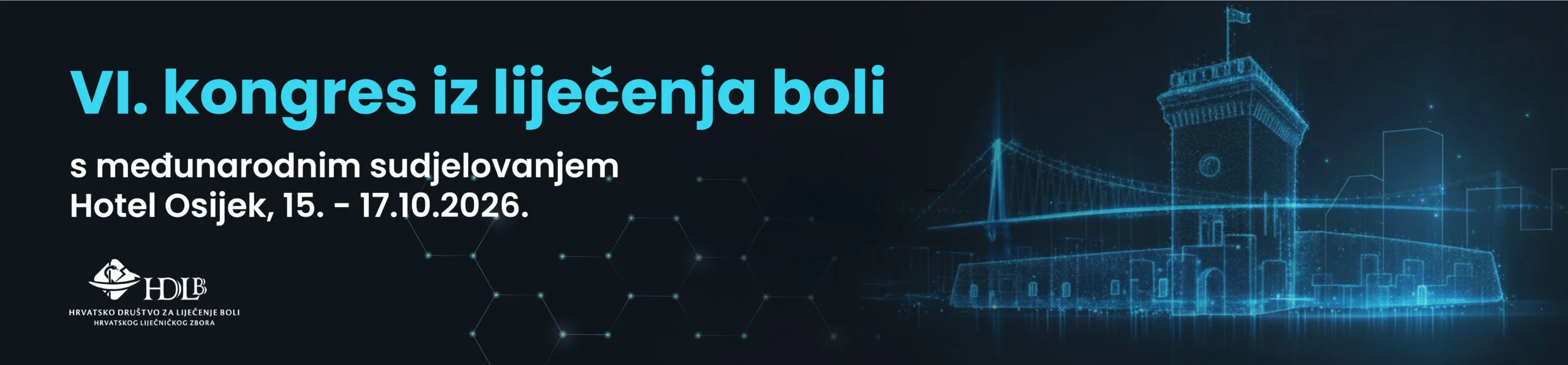 VI. hrvatski kongres iz liječenja boli s međunarodnim sudjelovanjem najvažniji je stručni skup Hrvatskog društva za liječenje boli – Hrvatskog liječničkog zbora, a održat će se u Osijeku, od 15. do 17. listopada 2026. godine u Hotelu Osijek. Kongres je namijenjen liječnicima svih specijalizacija, fizioterapeutima, psiholozima, medicinskim tehničarima i radnim terapeutima. Zastupljene će biti sve teme iz medicine boli, a uz istaknute domaće predavače, očekujemo i sudjelovanje vodećih međunarodnih eksperata koji se bave liječenjem boli.